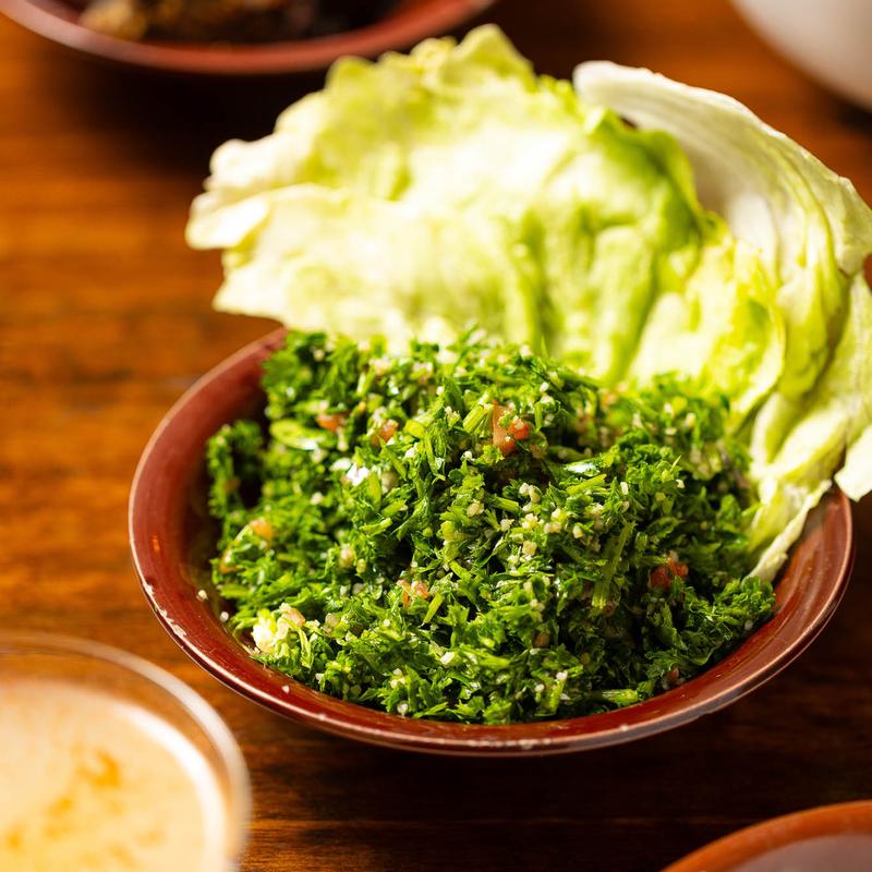 Crispy bulgur shell stuffed with ground beef, onions and pinenuts