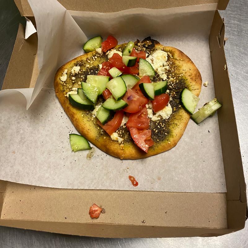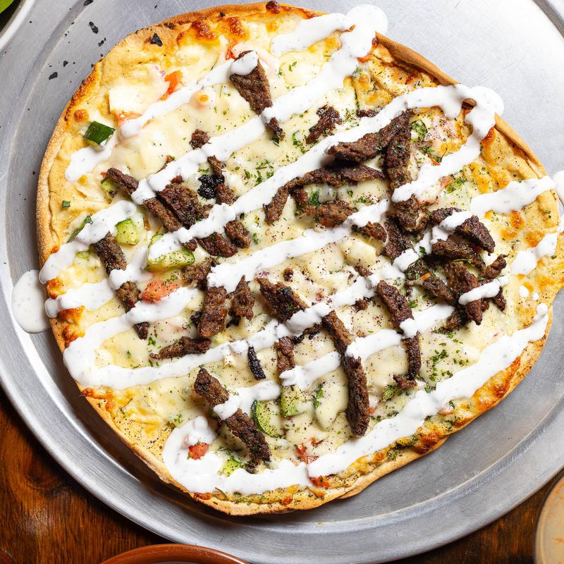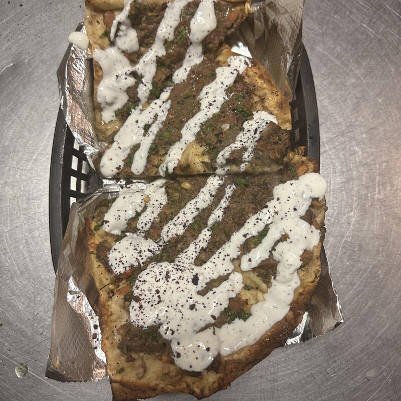 Garlic sauce, mozzarella, feta, tomatoes, banana peppers, with tahini.