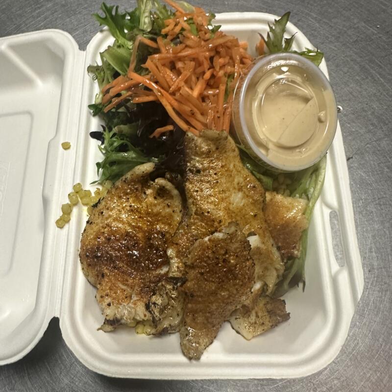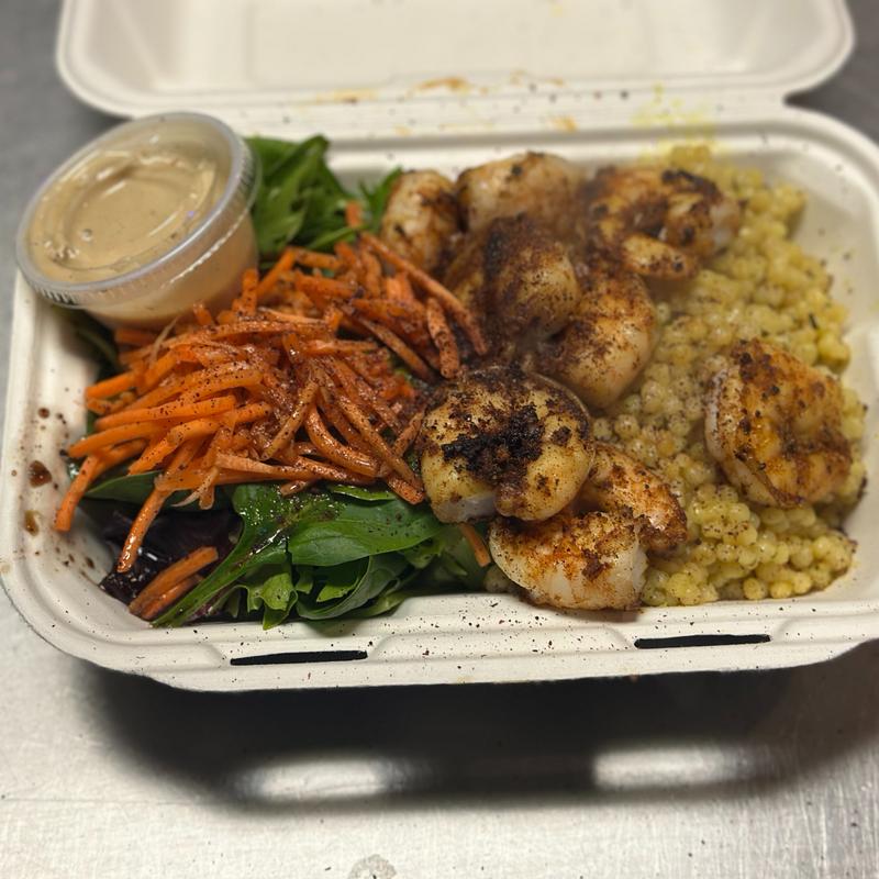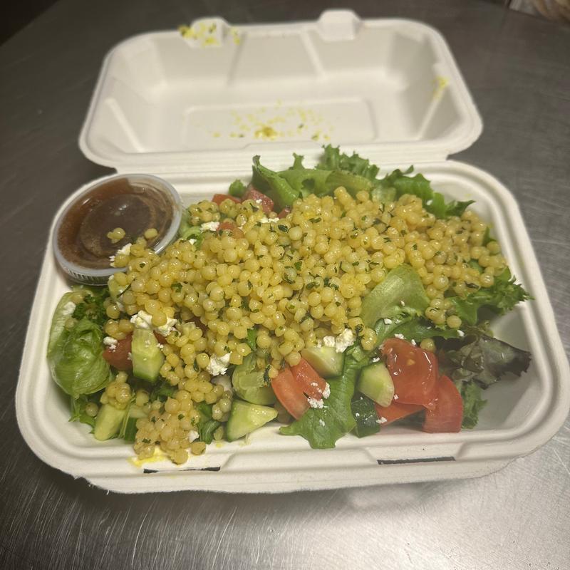 Greens, cucumbers, tomatoes, feta cheese, toasted couscous, and balsamic vinaigrette.