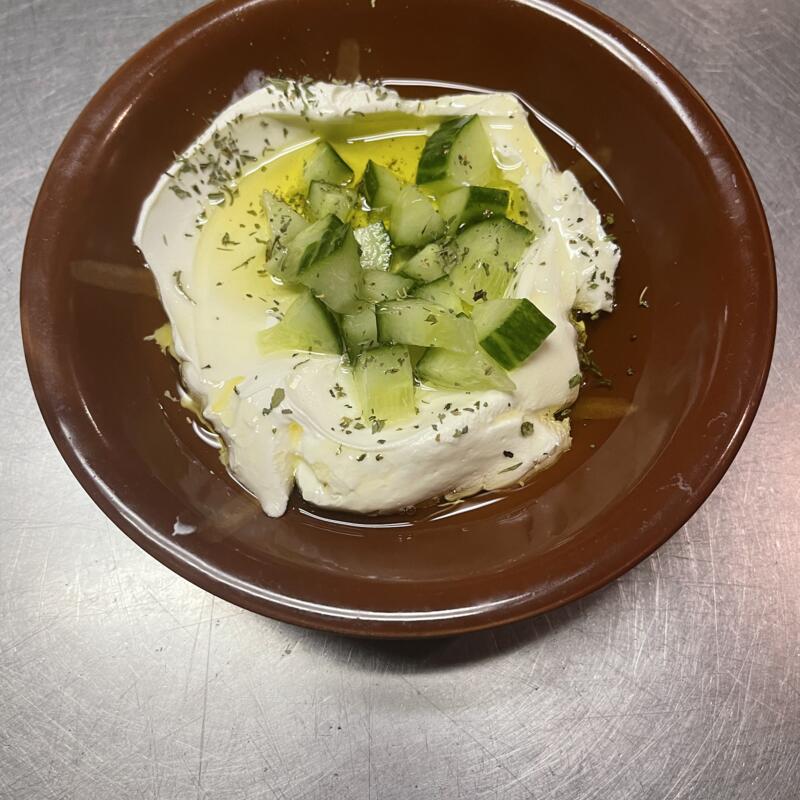 Hummus, mozzarella, feta, tomatoes, onions, cucumbers, and tzatziki.