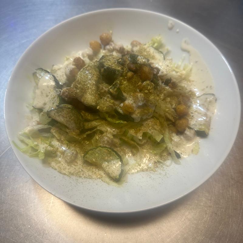 Fried Zucchini, Pinenuts, Chickpeas, Yogurt sauce