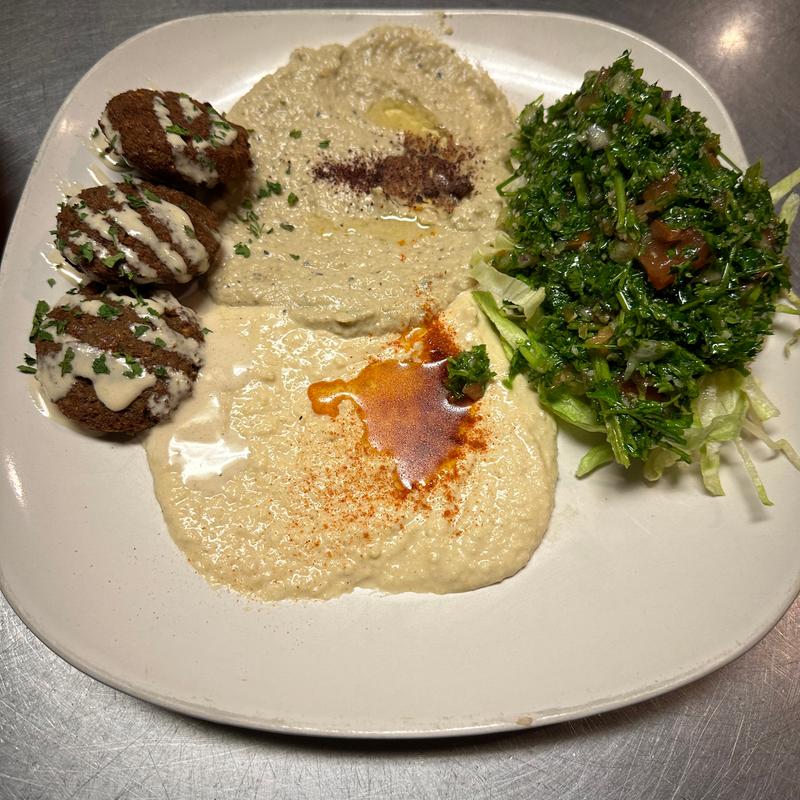 Hummus, baba ganoush, and tabouli.