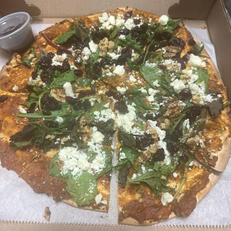 Roasted red peppers, walnuts, spinach, pomegrante molasses, feta cheese, and craisins.