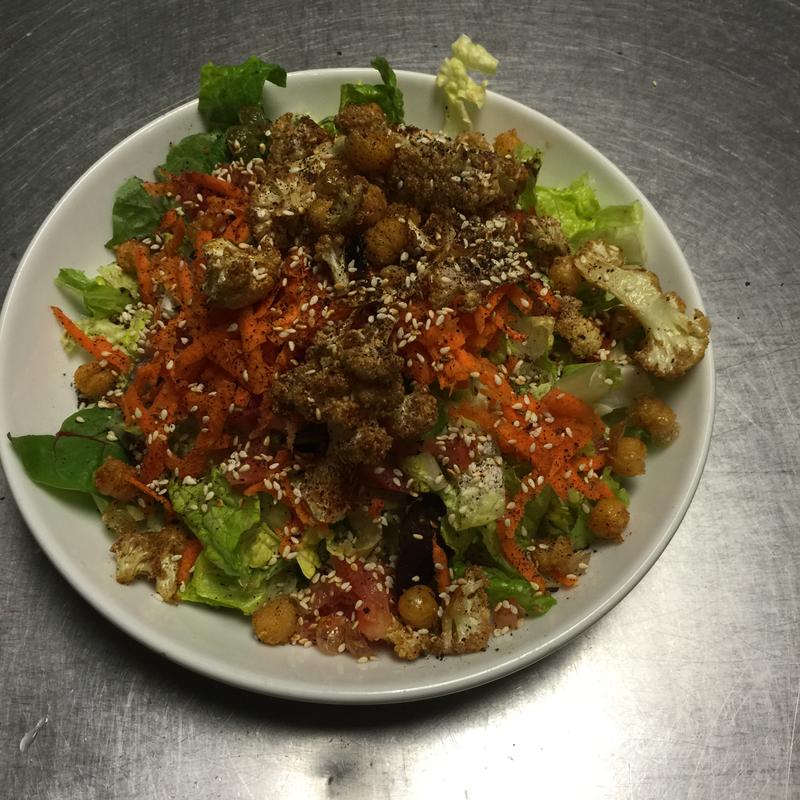 Greens, shredded carrots, tomatoes, fried cauliflower, chickpeas, sesame seeds, and tahini vinaigrette.