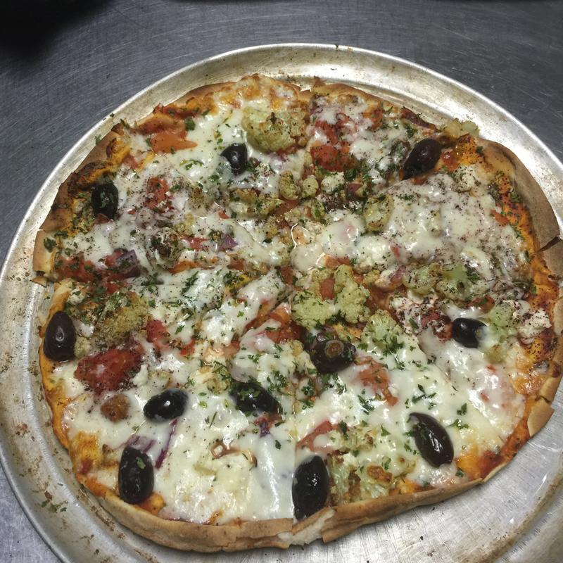 Mozzarella, feta, tomatoes, onions, kalamata olives, cauliflower, and marinara or white sauce