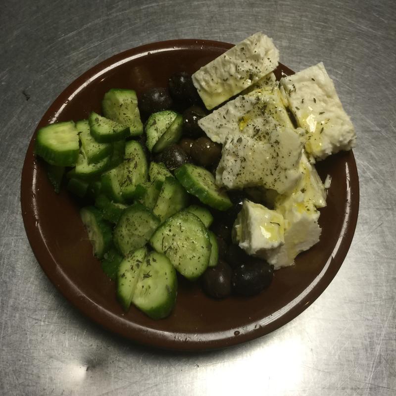 Lebanese olives, feta cucumbers, and olive oil.